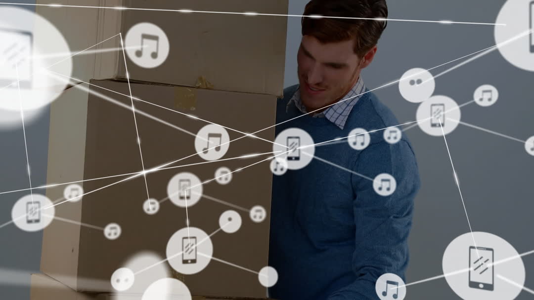 Man Carrying Boxes with Overlay of Music and Tech Icons Video