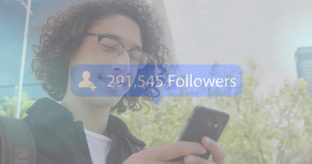 A man with curly hair is seen focused on a smartphone. A translucent overlay highlights '291,545 Followers', indicating the man is engaged in social media as an influencer or content creator. The presence of greenery suggests an outdoor setting, implying active digital lifestyle and social unseen aspects of someone's everyday online interactions. This video may be useful for marketing, influencer promotion, social media analytics posts, or discussions related to digital influence and technology.