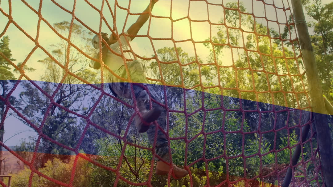 A man is enthusiastically climbing a rope net in an obstacle race. The scene is overlaid with the Colombian flag, adding a sense of national pride and athletic determination. This depiction can be used in contexts celebrating sports excellence, national sports events, or themes of perseverance.