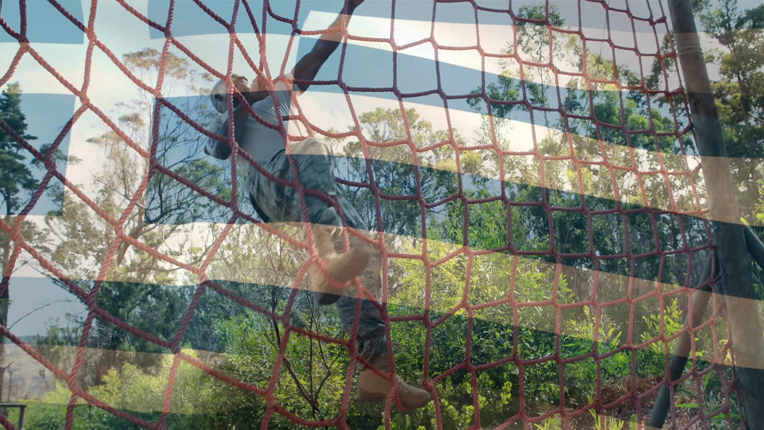 Man Climbing Obstacle Course Net with Greek Flag Overlay Video