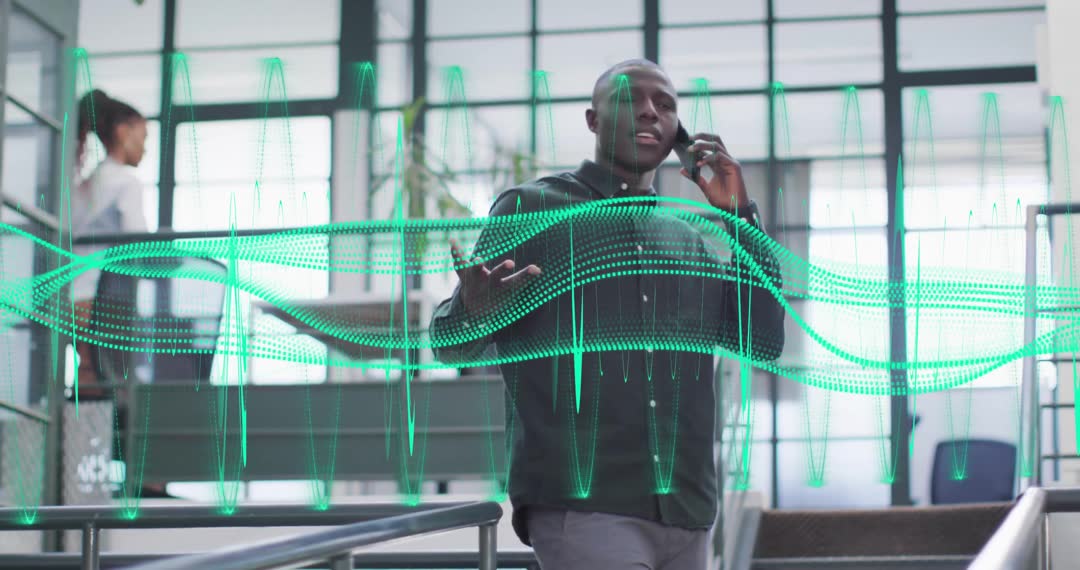 Man using smartphone while interacting with green digital wave symbolizes futuristic communication. This visual can illustrate technology-savvy environments, discussions about advanced digital products, or modern office workspaces. Excellent for promoting innovative ideas, tech conferences, or smart office solutions.