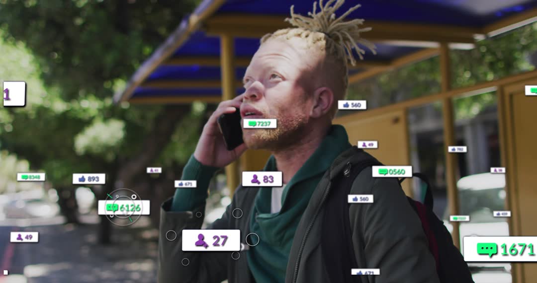 Scene captures man engaged in social media while making phone call at bus stop, depicting modern connectivity and digital interaction in daily leisure. Suitable for illustrating themes of urban lifestyle, online influence, and technology in everyday scenarios.