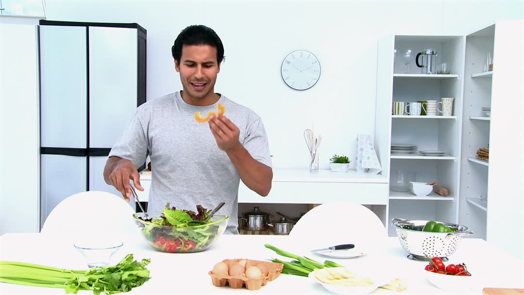 - Man Cooking and Tasting Salad in Modern Kitchen