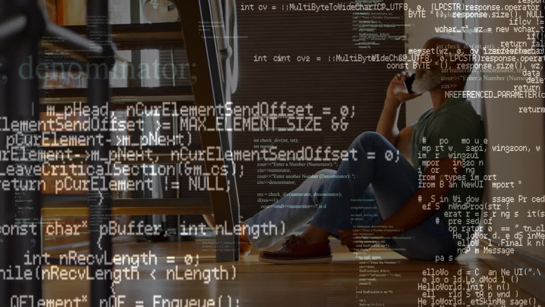 Image shows an African American man engaged in a business call while at home, with an overlay of coding and data elements. Useful for illustrating the concepts of remote work, modern communication, and the intersection of technology with everyday life.