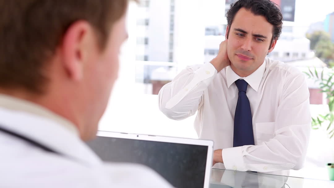 Man Discussing Neck Pain with Doctor in Office Consultation Video