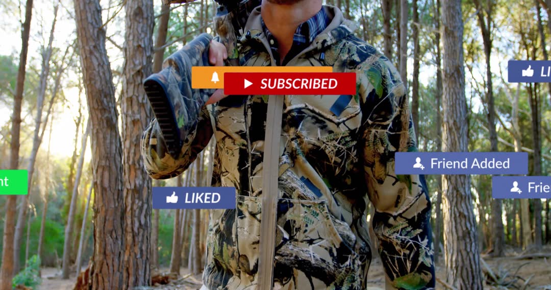 Man shown in camouflage jacket carrying rifle through wooded area, surrounded by online social media icons. Highlights synergy of outdoor activities and digital interaction. Ideal for use in media focusing on technology's role in modern adventuring, connecting traditional outdoor skills with contemporary digital world.