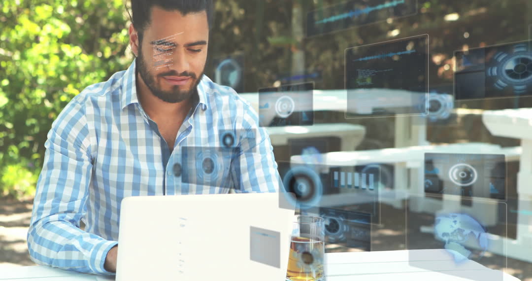 Man interacting with digital interface showing various data visualizations while using laptop in sunny outdoor setting. Ideal for illustrating technology trends, remote working environments, virtual workspace concepts, and futuristic digital activities.