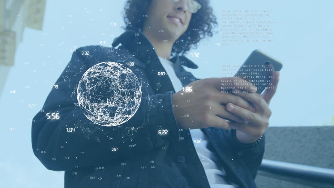 Man Engaged with Smartphone and Global Data Network Overlay Video