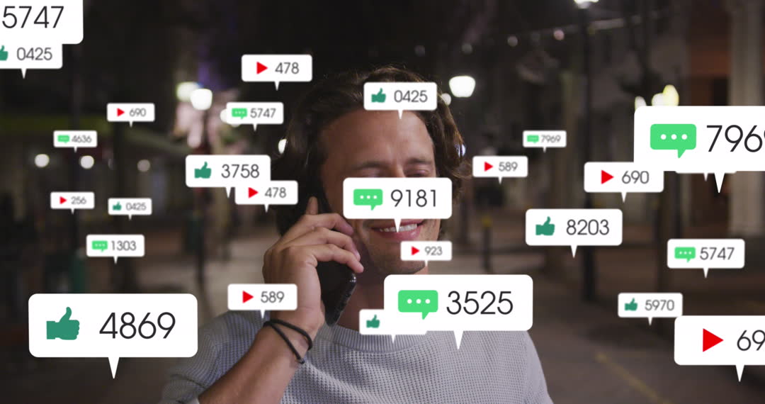 Dynamic visual with man interacting through smartphone as social media icons float around, implying digital connections. Suitable for illustrating concepts of social engagement, digital marketing, online networking, and technology advances. Ideal for use in articles about the impact of social media or internet connectivity.