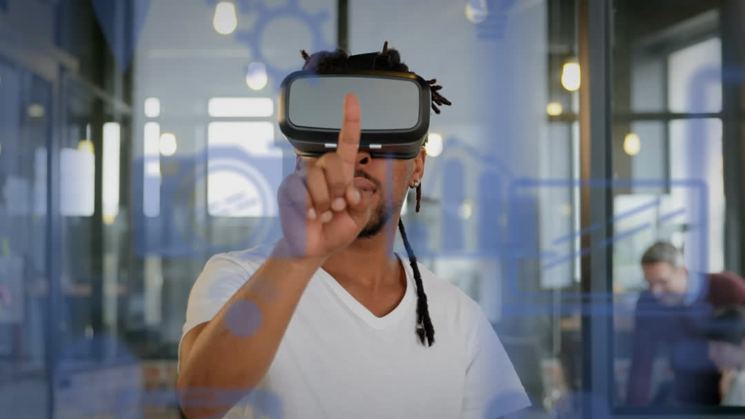 African American man wears virtual reality headset in modern office environment, engaging with immersive digital interface. Use this video in technology, business innovation, or digital marketing materials to showcase advancements in VR and interactive user experiences.