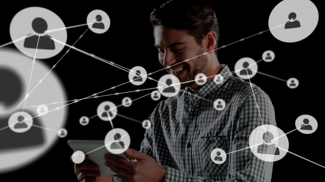 Man interacting with a digital contact network on tablet, representing connectivity and collaboration in professional settings. This footage is suitable for illustrating modern business solutions, digital marketing, or technological advances in communication and networking sectors. Ideal for showcasing innovation and the growing impact of digital transformation in various industries.
