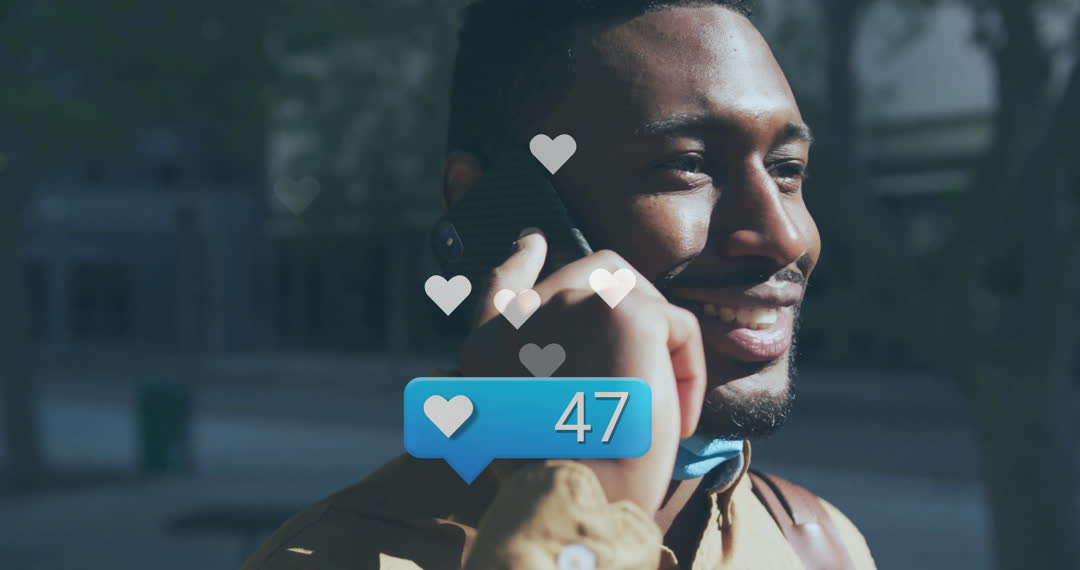 Smiling man engaged in phone call while digital social media icons representing likes appear prominently. Perfect for illustrating themes of modern communication, social media interaction, or seamless technology use.