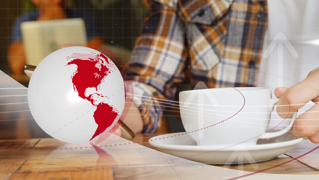 Image depicts a man using a smartphone while drinking coffee, highlighting global connections with an animated globe and network lines overlay. Useful for themes on digital innovation, global communication, and modern work environments. Ideal for technology and communication marketing materials.