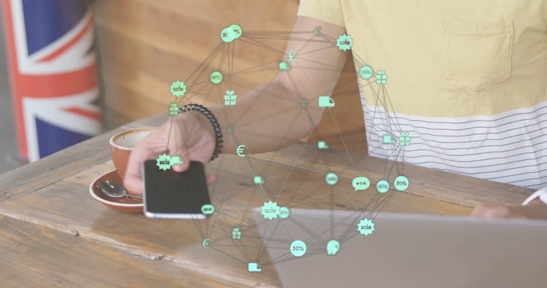 Man at cafe tapping smartphone and using laptop as digital network overlays hover. Represents engagement with e-commerce and modern technology in everyday settings. Ideal for illustrating concepts of remote work, global communications, networking power in the tech-savvy professional's life, or innovation themes within an urban setting.