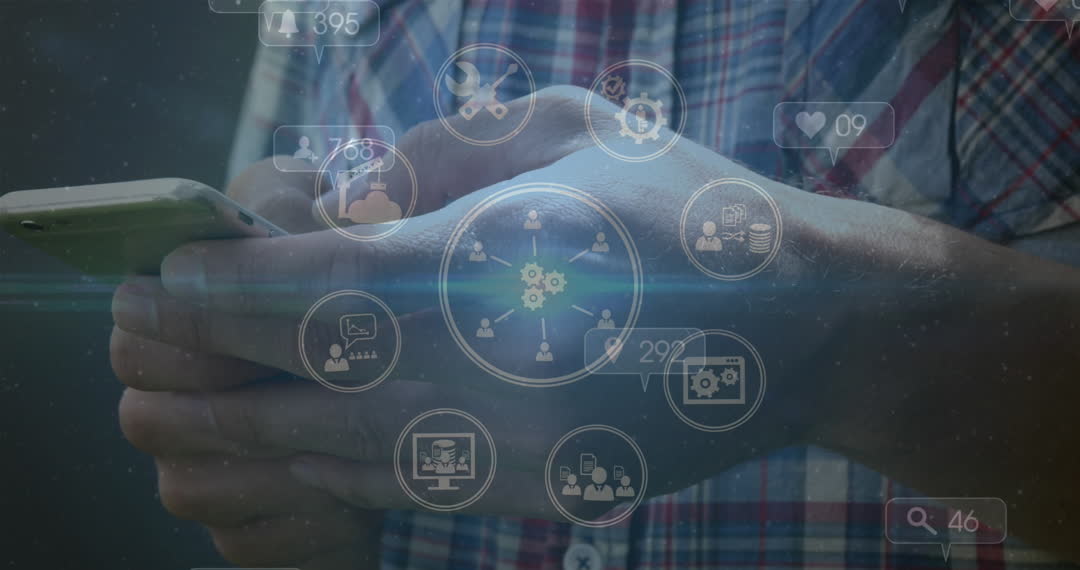 Digital icons hover around a man scrolling on a smartphone, representing modern technology interaction. Useful for illustrating concepts such as social media communication, innovative app designs, networking technology advancements, or digital user engagement.