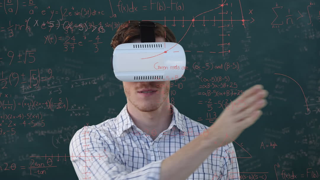 Man immersing in virtual reality with mathematical formulas on green chalkboard indicating studies or predictive data modeling. Ideal for content on educational technology, showcasing the integrations of digital solutions in modern pedagogical methods, futuristic business processes or tech innovation.