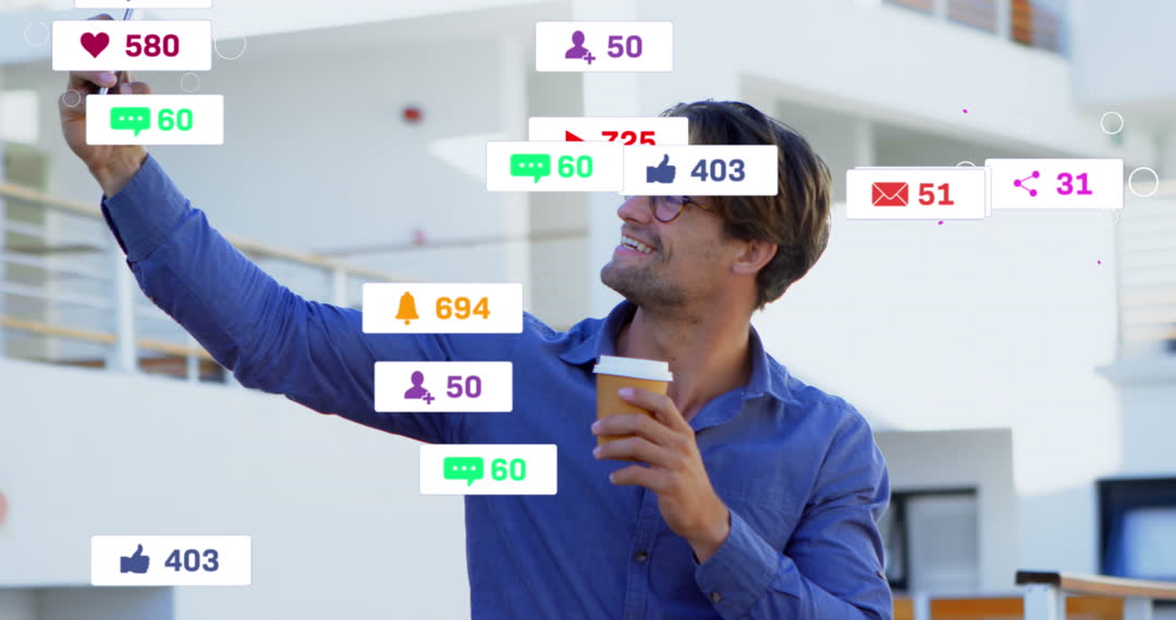 A man is taking a selfie, holding a coffee cup, surrounded by animated social media notifications, representing digital interaction and connectivity. Useful for illustrating social media concepts, digital lifestyle themes, and technology's impact on everyday life.