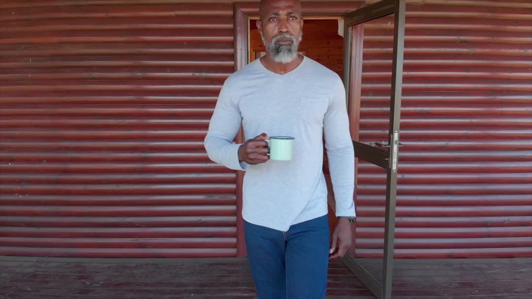 African American man holding a cup of tea while standing on the veranda of a log cabin. This serene scene captures a relaxed moment set in the countryside. Ideal for lifestyle and travel promotions featuring cozy rural escapes, content about relaxation and self-care, or advertisements highlighting products tied to domestic leisure and comfort.