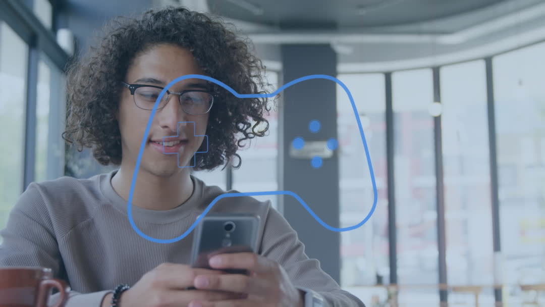 A young man with curly hair and glasses engages with a smartphone while a digital gamepad icon overlays the video. This visually modern setting signifies technology and gaming culture. Useful for promoting tech products, advertising mobile games, or illustrating lifestyles in digital communication.