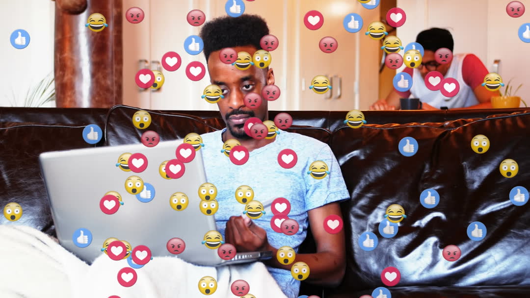 African American man interacting with various emoji reactions while online in home environment. Perfect for depicting digital communication, internet culture, or studying human interactions with technology.