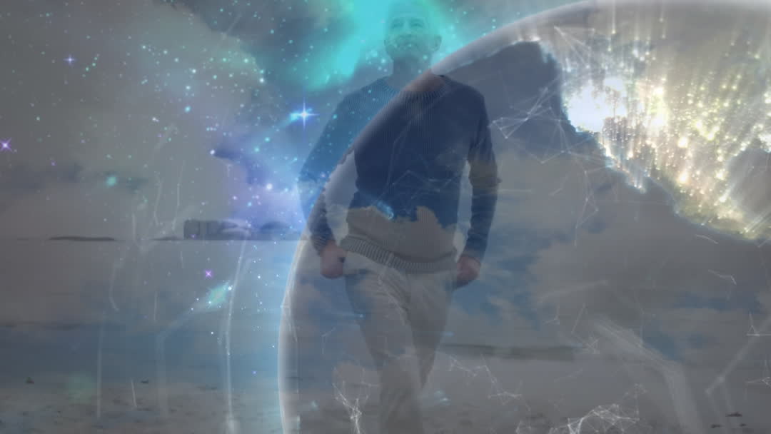 Man Exploring Beach Amidst Digital Globe and Stars Video