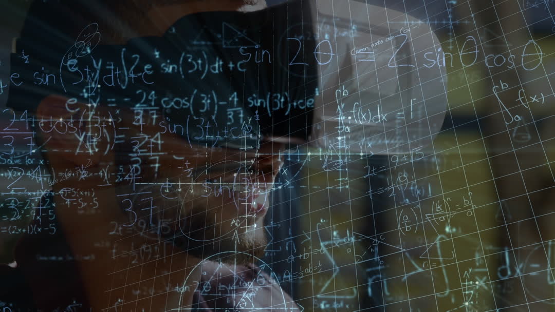 Man wearing a virtual reality headset with mathematical equations overlay. Perfect for illustrating concepts of modern education, virtual study environments, or advancements in technology.