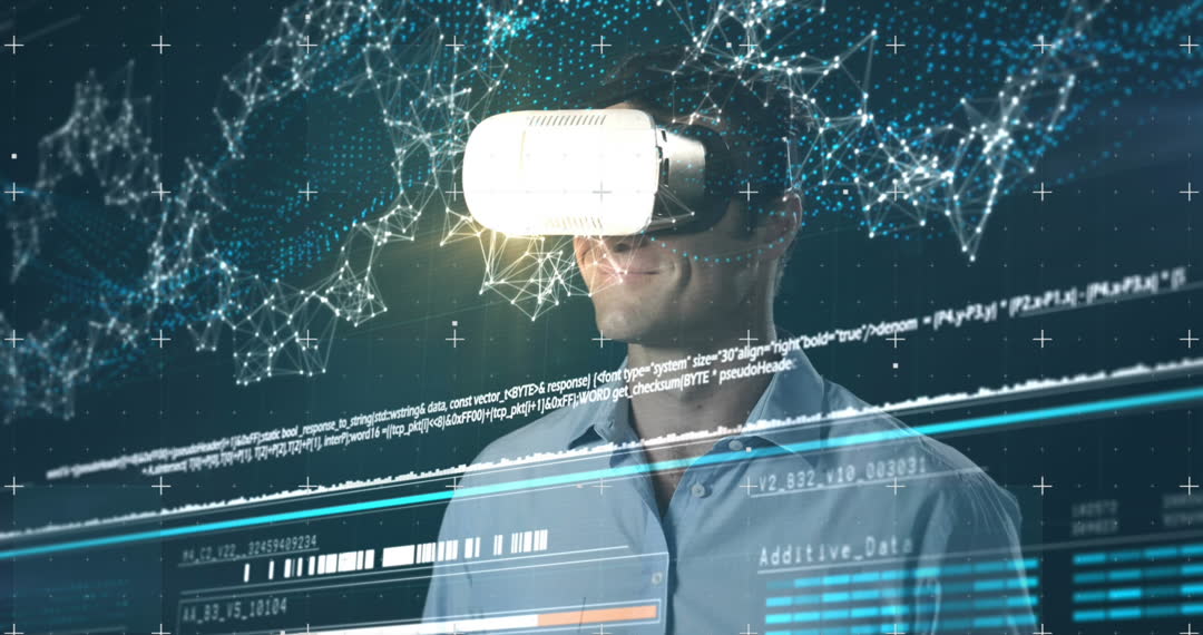 A man is seen wearing a VR headset while surrounded by floating digital interfaces and data streams. This visual illustrates the immersive capacity of virtual reality technology combined with dynamic data representation, suitable for use in presentations about tech innovations, digital future concepts, or advertisements related to VR products.