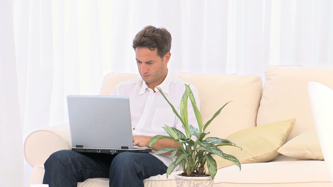 Scene of man concentrating on laptop while comfortably seated on cream sofa with soft pillows, nearby green houseplant enhancing the serene ambiance. Ideal for content about remote work, productivity at home, and modern living spaces.