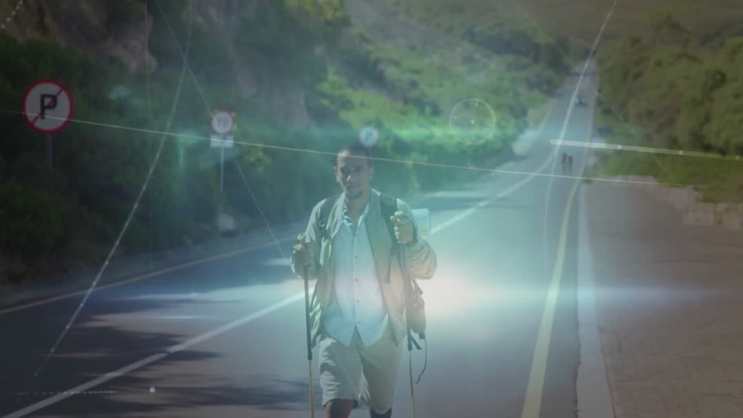 Image depicts a man hiking along a road with vibrant digital data processing animation as an overlay, symbolizing the integration of technology with outdoor exploration. The setting is a bright, open road flanked by hills, capturing the spirit of adventure and travel. This video is ideal for use in themes related to outdoor adventures enhanced by technology, promoting innovation in travel gear or mobile apps aimed at explorers. Also suitable for concepts of futurism and modernization.