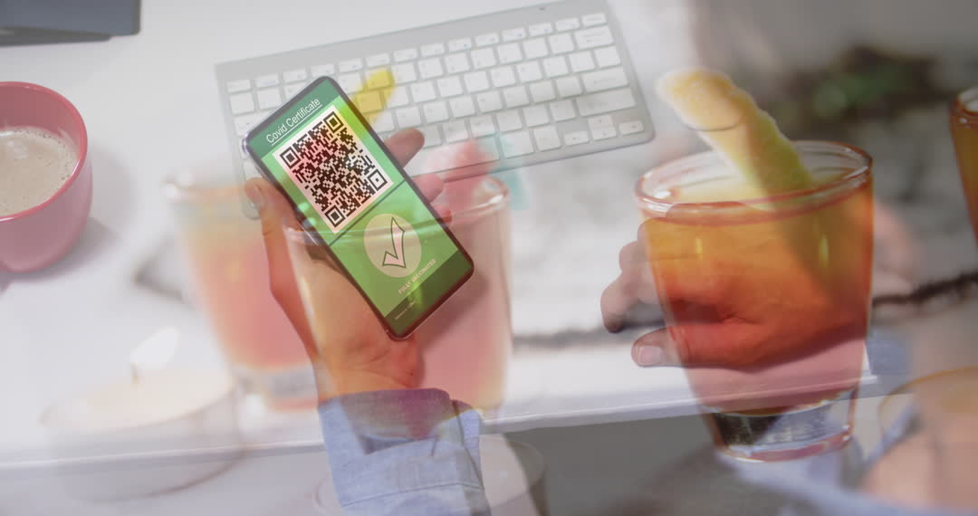 Visualizing the intersection of technology and health security, this video depicts a man holding a smartphone displaying a digital Covid passport, symbolizing modern vaccination verification. Overlay of drinks adds a social aspect, relevant for themes around travel safety, events reservations, or hospitality industry promoting responsible reopening or guidelines. This is suitable for content related to tech solutions in pandemic controls, lifestyle changes due to Covid-19, or public health awareness during events.