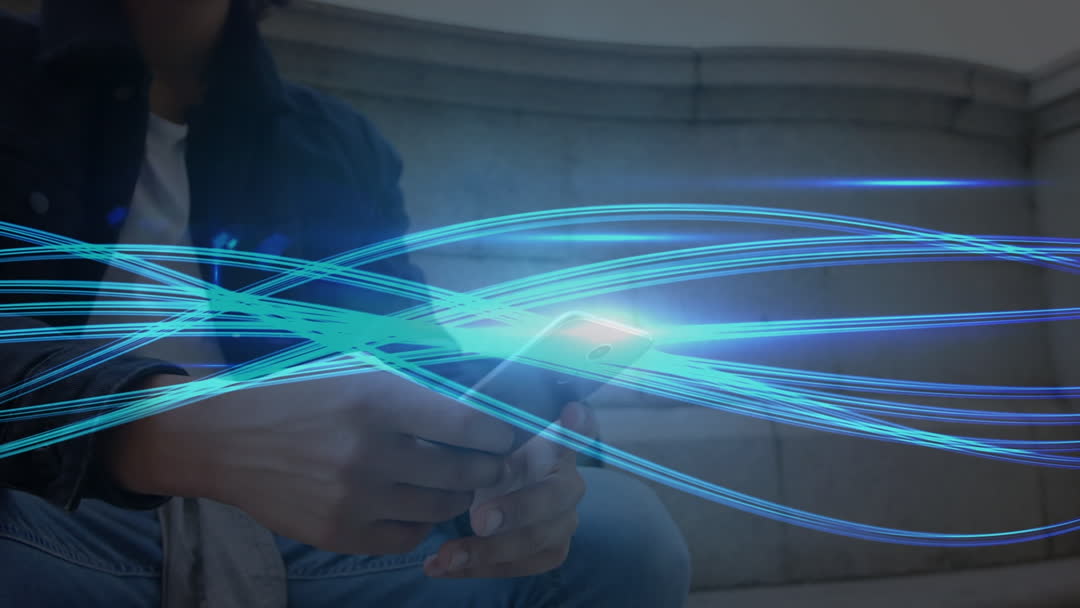 Hands of a man holding a smartphone with dynamic blue lights symbolizing data movement and connectivity lines flowing across. Perfect for illustrating digital communication, modern technology advancements, internet usage, networking, and futuristic connectivity solutions.