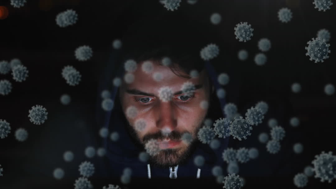 Man in hoodie intensely observing computer with digital viruses overlaying screen. Image highlights focused study and technology within pandemic context, illustrating modern work, cybersecurity, and digital threats. Useful for articles and materials on pandemic data analysis, cybersecurity, global health crisis topics, or research methodologies.