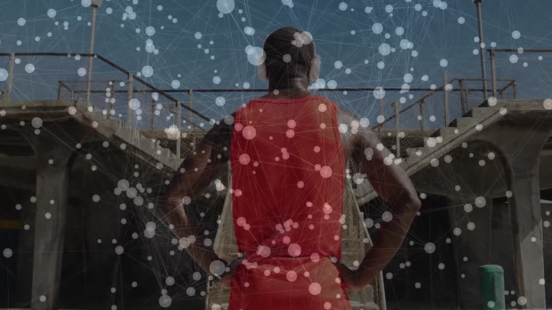 A man in a vibrant red shirt stands confidently surveying an expansive urban construction site, overlaid with a digital network structure symbolizing the interconnected future of urban areas. The scene merges the physical with the digital, reflecting the role of technology and innovation in developing modern architecture and engineering projects. Ideal for use in articles or presentations discussing urban design, smart cities, construction innovation, connectivity between physical and digital architecture, or technological advances in city planning.