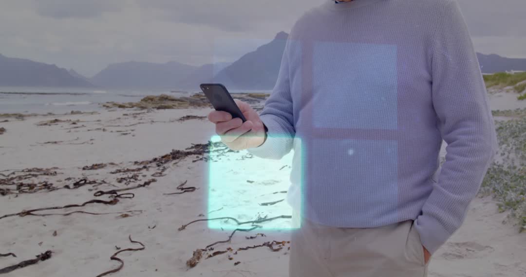 Man on tranquil beach engaging with smartphone while a digital animation overlay is visible. Represents technology in leisure, summer vacation experiences, connectivity, innovative digital interactions. Perfect for themes of travel, tech in relaxation, modern lifestyles, or digital advancements.