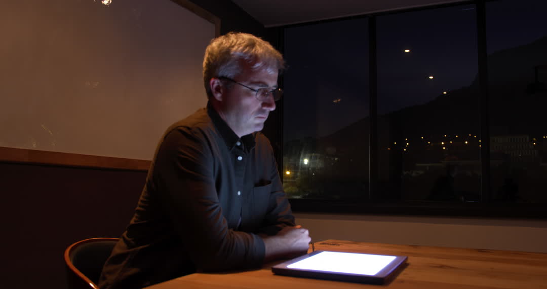 - Man Interacting with Virtual Interface on Tablet at Night