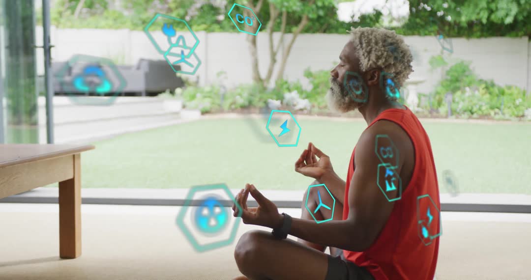 In this video, a man is meditating on an outdoor patio with multiple blue, digital hexagon icons displaying energy metrics around him. He is practicing mindfulness, conveying a sense of calm and balanced well-being in a natural setting. The futuristic overlay with hexagon icons suggests an integration of wellness and digital technology. This video can be used for wellness apps, meditation guides, or promotional content about incorporating technology into holistic practices.