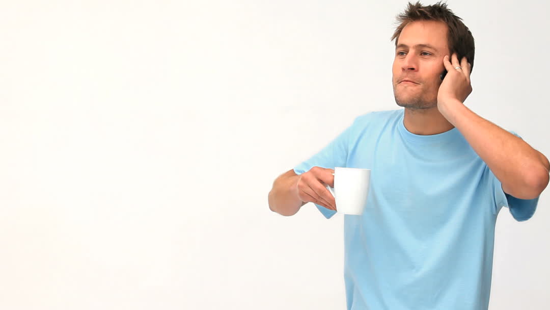 - Man Multitasking with Phone Call and Coffee in Bright Background
