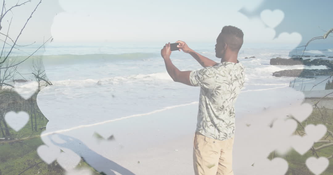 - Man on Beach Taking Selfie Surrounded by Romantic Hearts