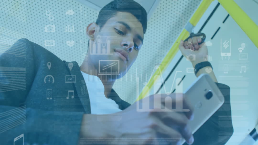 A young biracial man standing in a bus holds onto a support with one hand while using his smartphone. Various digital icons and stock market symbols overlay in the foreground, suggesting engagement with technology or financial data analysis. This is ideal for visual representations in articles or promotions focused on mobile tech, finance apps, or urban commuting lifestyle.