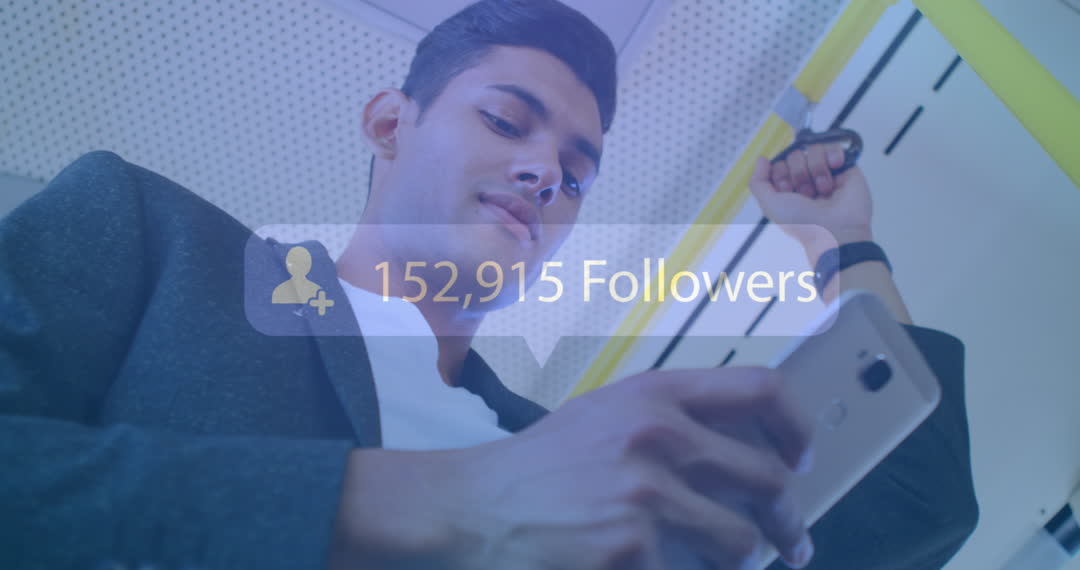 A businessman rides a public transport while engaging with his smartphone, highlighting his growing social media presence, depicted by the follower count overlay. Perfect for concepts related to social networking, technology impact on connectivity during commutes, and influence building in digital spaces.