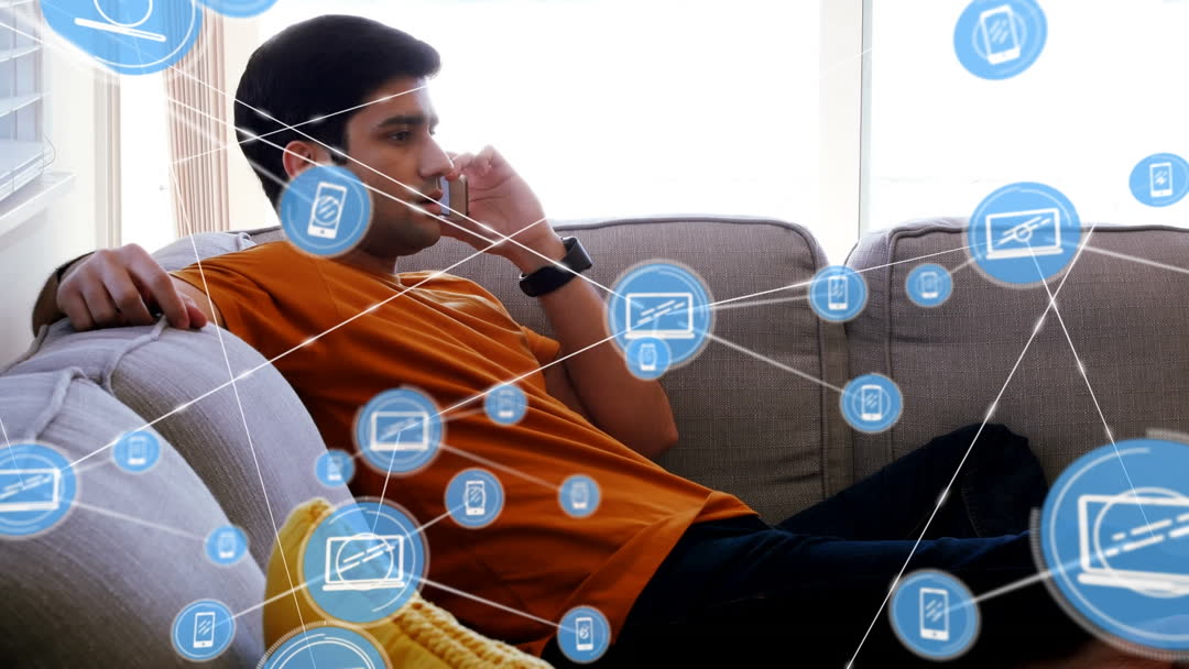 Man seated on couch using smartphone surrounded by animated network icons representing technology and connectivity. Useful for illustrating digital communication, smart devices, and modern habits at home. Ideal for tech-related advertisements, digital lifestyle articles, and innovative network solutions features.