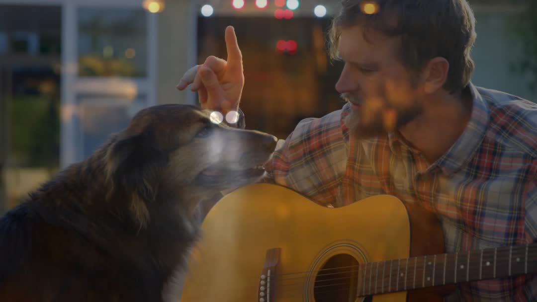 - Man pausing guitar strum to pet dog through window while warm bokeh lights glowing