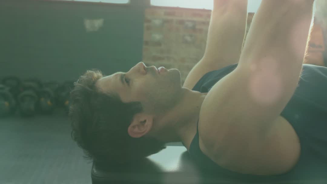 Man Performing Bench Press Under Backlight with Motion Lines and Cinematic Lens Flare Video