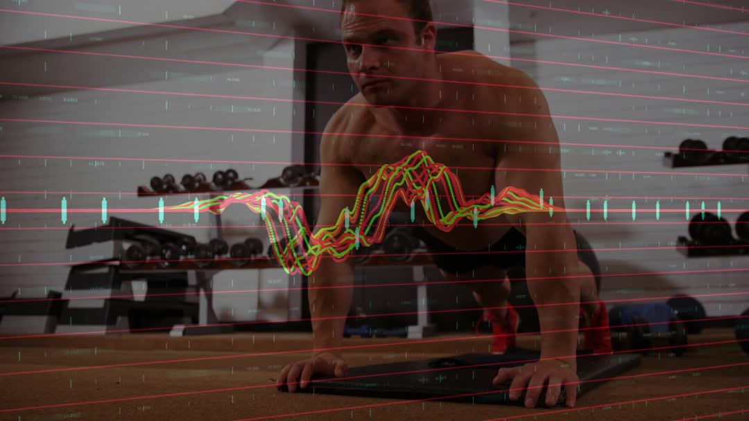 - Man Performing Push-Ups While Syncing Biofeedback Waveform in Home Gym Workout