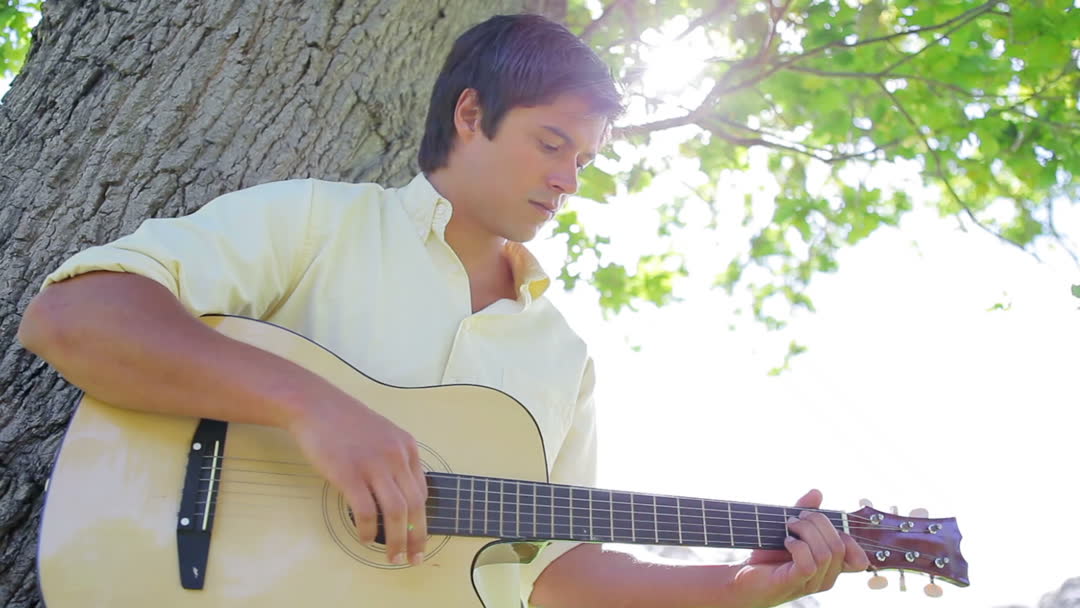 - Man Playing Acoustic Guitar Outdoors Under Sunny Tree
