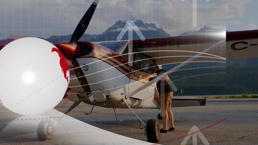 A man checks a small plane on a runway positioned against a digital interface with globes and upward-moving arrows, suggesting global communication trends and advancing travel technologies. Useful for concepts in aviation advancements, global networking, and technological innovation themes in business and travel content.