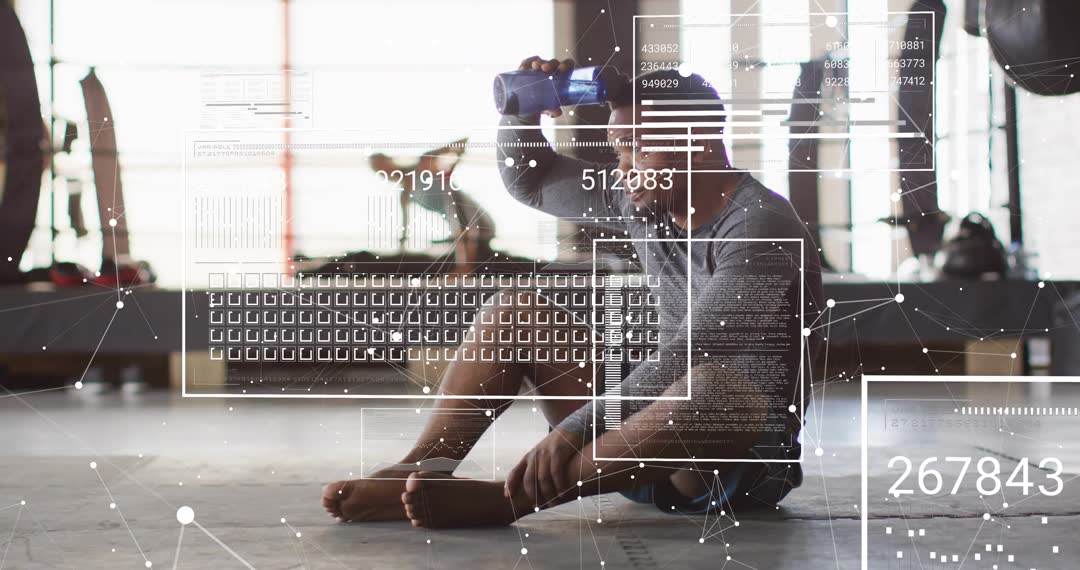Video showing man reaching for blue water bottle while resting on gym floor after intense set. Backlit windows creating dramatic silhouette and soft depth across frame. Digital HUD overlays mapping hydration metrics, numeric readouts, and network-style node connections, blending athlete recovery with wearable tech and real-time data visualization. Motion conveying fatigue, focus, and deliberate recovery during training break. Use for fitness app demos, hydration tracking campaigns, sportswear or gym branding, athlete lifestyle content, wellness and corporate health presentations, and tech startup pitches illustrating AR or IoT integration. Pair with on-screen tips for hydration, use as hero clip for social media reels or website banners, and crop for commercial ads, explainer videos, or streaming promos.