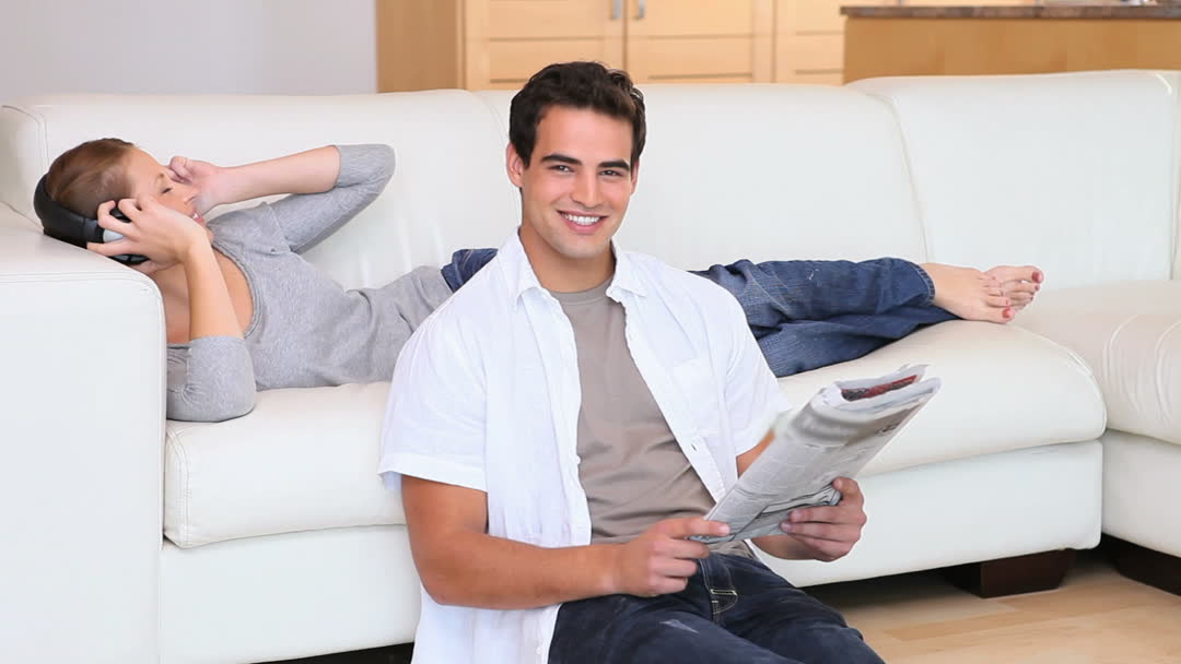 Man sits on floor with newspaper, smiling at camera, while woman leans back on sofa wearing headphones. Scene portrays a relaxed home atmosphere with modern lifestyle activities. Ideal for illustrating leisure time, home comfort, or relationship dynamics in lifestyle magazines or online articles.