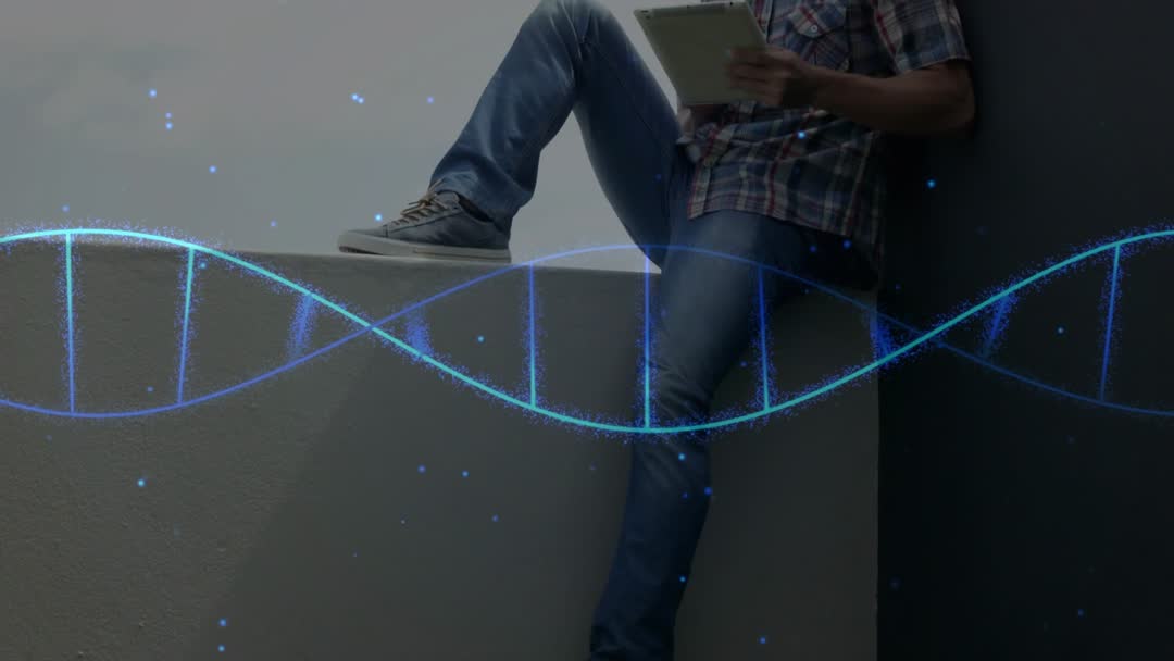 - Man reading tablet on rooftop with glowing DNA helix overlay for health visualization