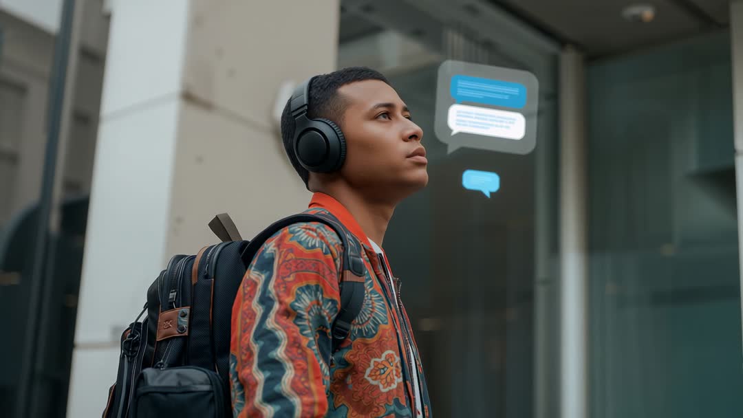 AI Generated Image. A young man in a colorful bomber jacket walks along a city sidewalk, surrounded by AI-generated chat bubbles, symbolizing modern connectivity and technology. He wears headphones and a backpack, adding to the sense of casual, tech-driven life in urban settings. This video is perfect for illustrating themes of digital communication, city life, or the interaction between humans and technology in future-focused content.